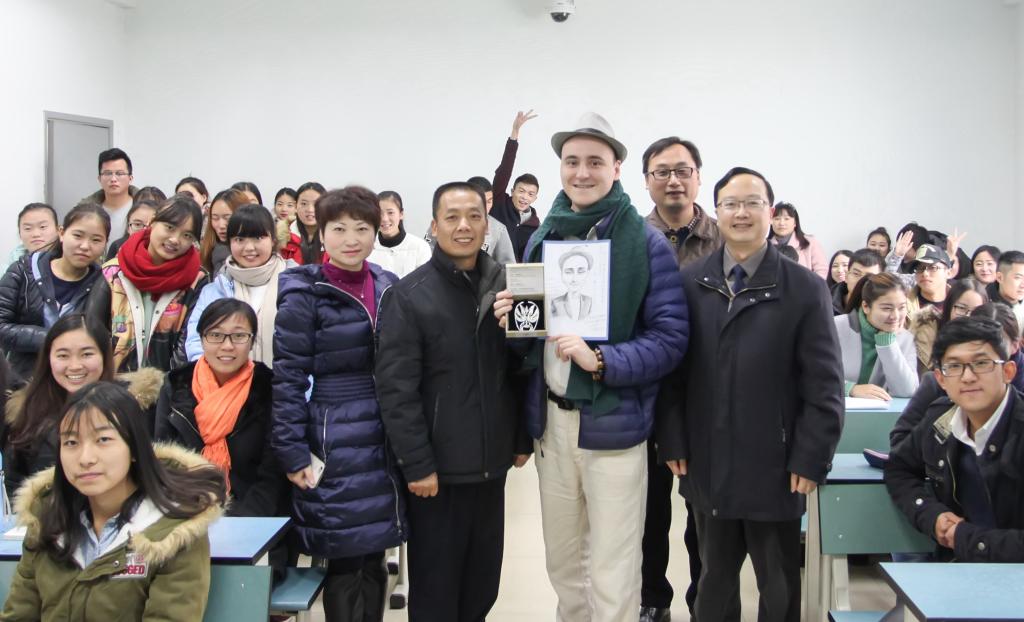 罗院长用英语向外教表达了圣诞祝福及一年来辛勤执教无私付出的感谢,肯定了外教的教学成果。他指出,两位外教对待工作态度认真负责,教学风格独特新颖,我校学生英语水平和学习英语积极性都得到明显提高。在佳节来临之际罗晓东院长与肖必恒副院长代表全校师生向两位外教送上了我校文博学院师生制作的传统银花丝手工艺品以及外教钢笔肖像画。